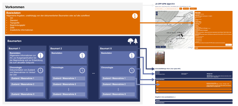 Die Daten jeder Baumart bestehen aus Basisdaten und einer Chronologie. Die Basisdaten sind allgemeine Angaben zur Baumart, zur Ausgangssituation bei der Begründung und zur Entwicklung der Baumart bis zum aktuellen Zeitpunkt (siehe Bild). In der Chronologie kann eine beliebige Anzahl von Zuständen und Massnahmen erfasst werden, um die Entwicklung der Baumart über die Zeit zu dokumentieren. Idealerweise wird ein erster Zustand mit dendrometrischen Grössen und ggf. Fotos schon bei der Begründung eines neuen Vorkommens erfasst.